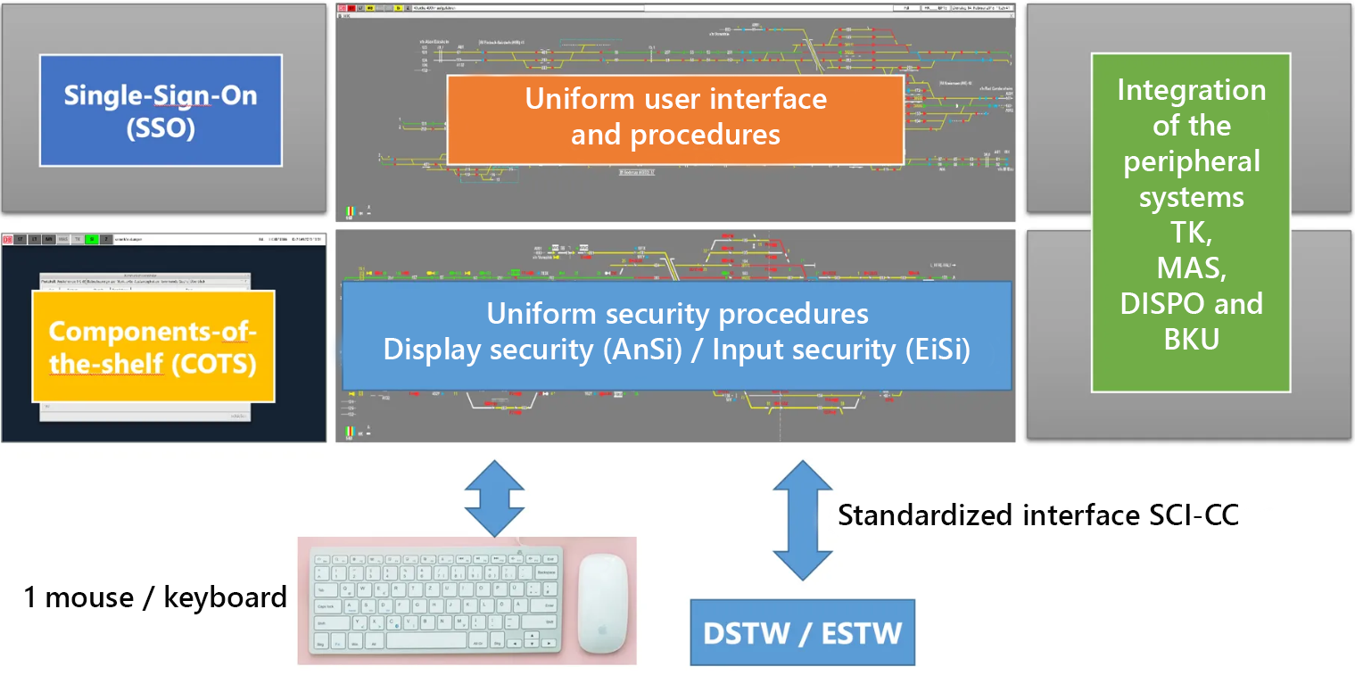 With a user interface based on the latest web technology, the movable detailed view of the interlocking area (“panning”), the large, central 50'' monitor and configurable backlighting, a contemporary and very high level of operating convenience is offered by the iBS. Flexible personnel deployment planning is supported by the manufacturer-independent and standardized operation of the connected DSTW/ESTW. Further details such as single sign-on for applications makes the daily work of the train dispatcher considerably easier.